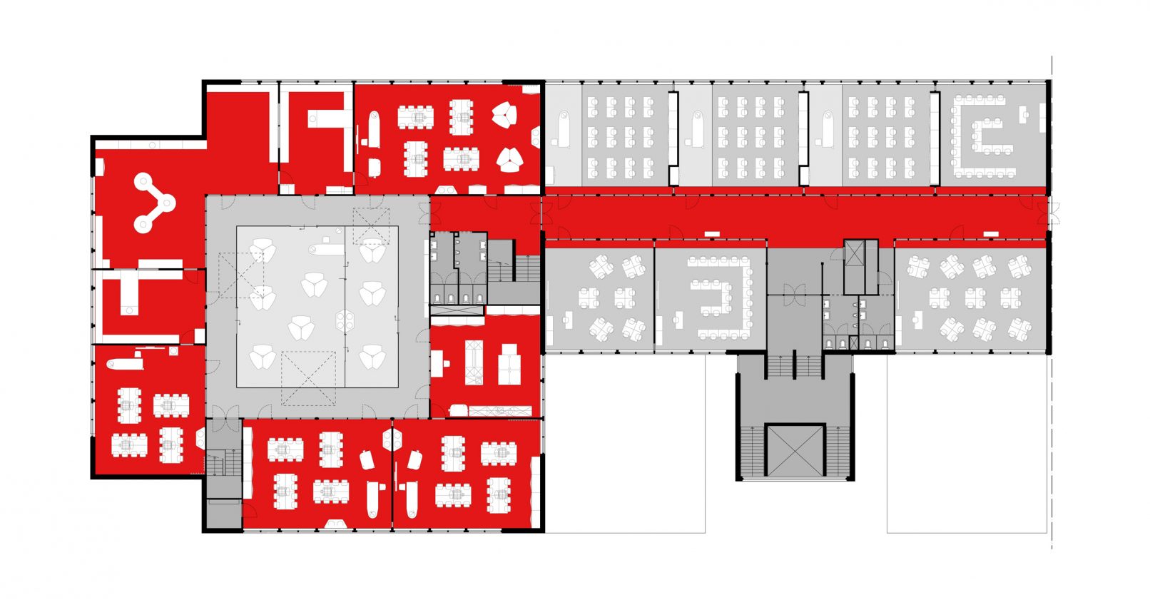 In een tijd waar synergie en kruisbestuiving essentieel zijn voor het ontwikkelen van nieuwe inzichten vraagt deze omgeving ook om een radicaal andere benadering. We stelde voor om juist zichtbaar te maken wat voor spannende en intrigerende onderzoeken er allemaal plaatsvonden in de lokalen. Het binnengebied werd getransformeerd tot het kloppende hart van de vleugel. Hier is het centrale lab ingericht en omzoomd door volledig glazen wanden waardoor iedere voorbijganger direct zicht heeft op wat er zich daar afspeelt. Door de lokalen rondom tevens te voorzien van veel glas reikt het daglicht tot in het centrale lab en ontstaat een heel lichte en frisse laboratorium omgeving.