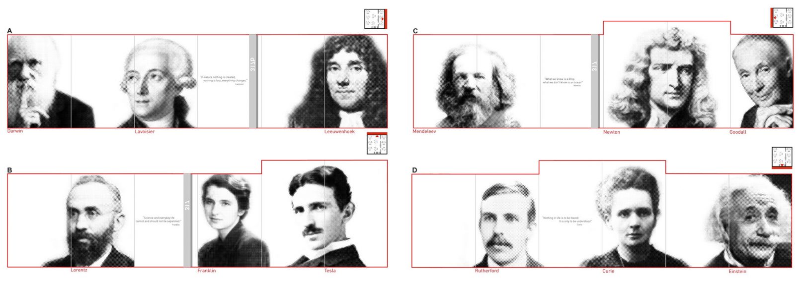 Net zoals het 200-gebied heeft dit gebied ook een eigen identiteit gekregen door kleurgebruik, ruimtegebruik, materialisatie en inrichting zonder een compleet andere aanpak te hanteren. We wilden samenhang creëren binnen het gebouw maar een eigen identiteit geven aan de onderwijs gebieden. Bijzonder zijn de geabstraheerde idolen welke op de volglazen wanden rondom het centrale lab afgebeeld zijn. We hebben de docenten gevraagd om lijstje met 9 idolen te maken. 3 natuurkundige, 3 scheikundige en 3 biologen. Hiermee ontstaat een directe en heel persoonlijke verwijzing naar de mensen achter de intelligentie en vondsten welke onderwezen worden.