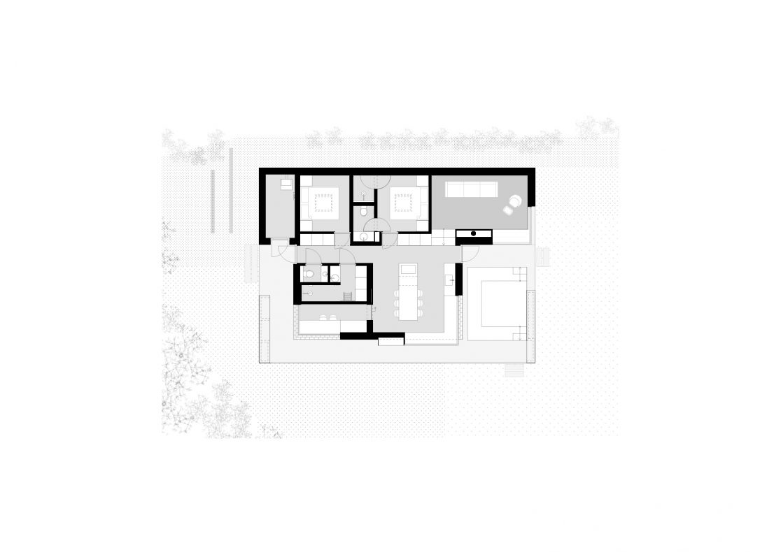 Regelgeving op het eiland dicteert een maximale bruto bebouwingsenvelop van 110 m2 binnen een strak omlijnt bouwvlak. Binnen dit compacte oppervlak is een diverse pallet aan verblijfsmomenten gecreëerd met allen een heel eigen karakter en verblijfskwaliteit gedurende de dag en door de seizoenen heen.