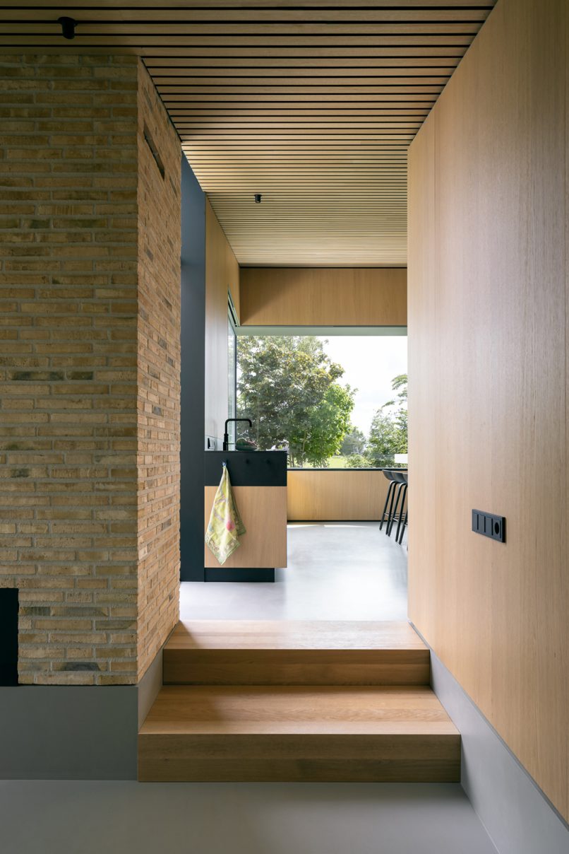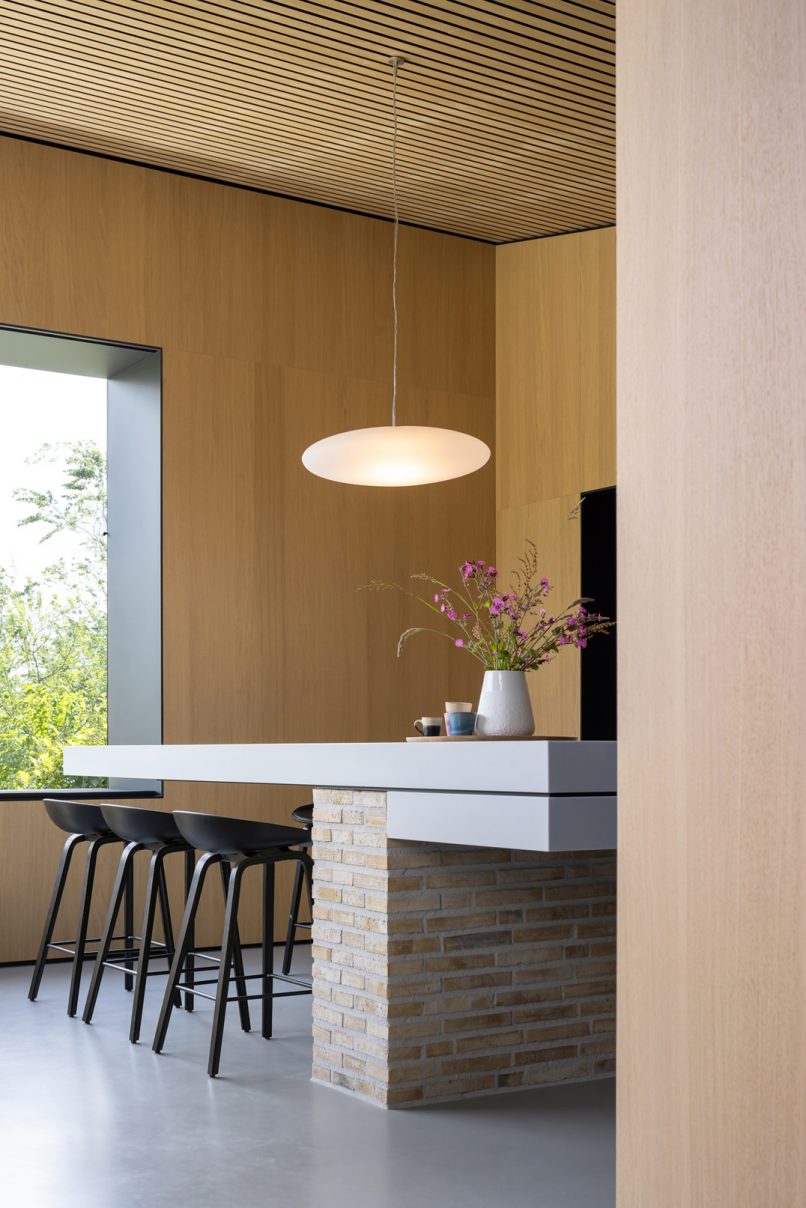 We hebben ervoor gekozen om het doorgaans ondergrondse fundament van de woning juist zichtbaar te maken. Een stevig basement waarop de woning staat maar waar ook ruimtes in verzonken zijn. Dit zorgt ervoor dat de woning verankerd wordt op het eiland en samen met het metselwerk het lichte houtskeletbouw casco beschermd.