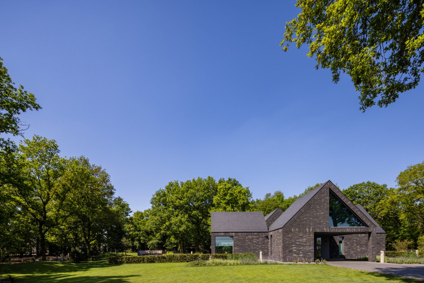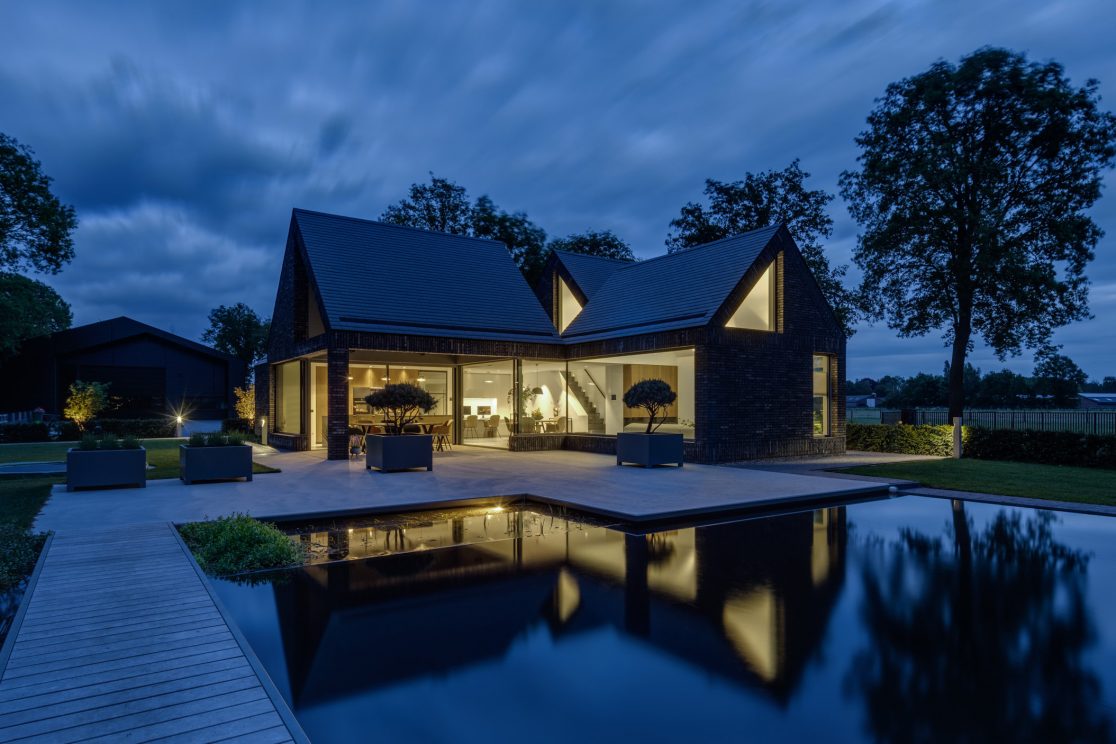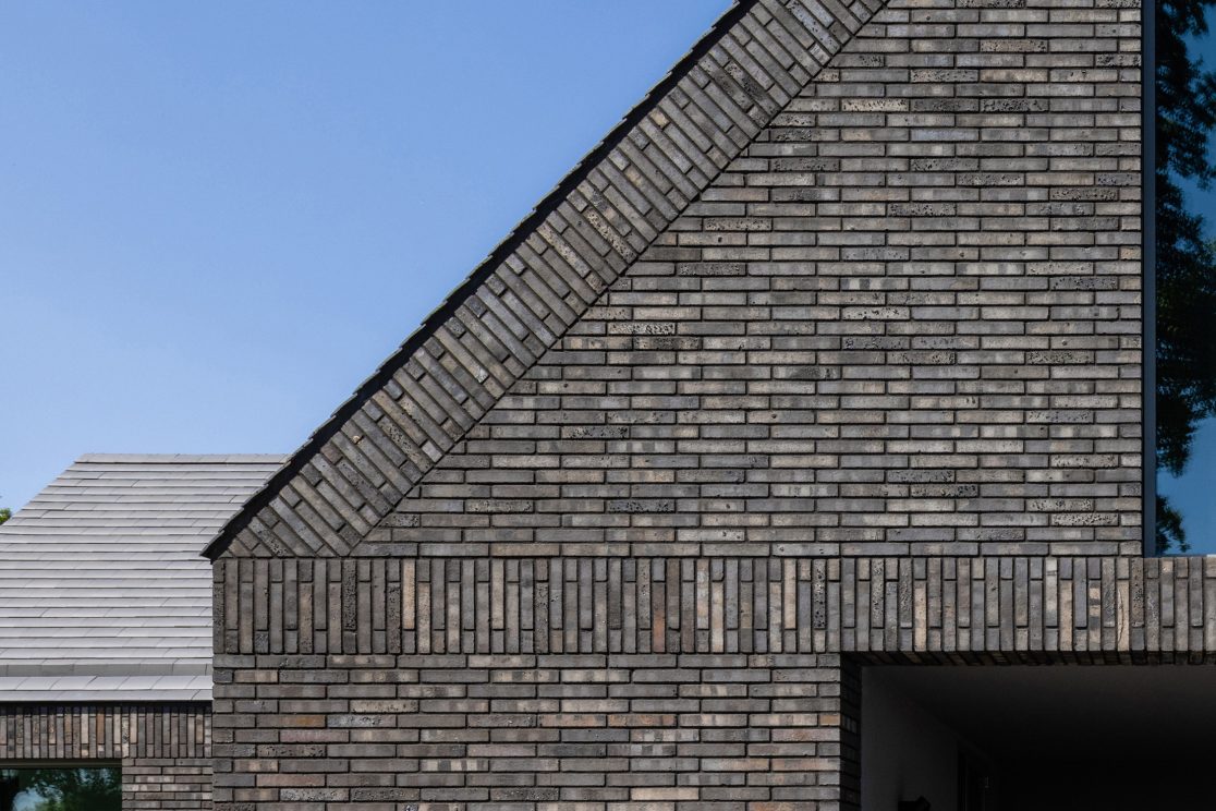 De abstractie in de detaillering en de expressieve gevelopeningen met diepe negge geven het woonhuis een monolithische uitstraling en versterken de archetype vorm. Hiermee worden de individuele volumes van buitenaf leesbaar. Middels banden in staand metselwerk is de plint, dakrand en verdiepingsvloer ingekaderd. Hierdoor ontstaat een raamwerk waarbinnen dichte metselwerkvlakken afgewisseld worden met grote gevelopeningen welke werken als geometrische canvassen op het landschap. De slanke aluminium kozijnen zijn qua maat en schaal volledig dienend aan het met zorg gedetailleerde en uitgevoerde metselwerk. De steenkeuze, een kolen gesinterde strengpers baksteen brengt in detail de twee karaktereigenschappen van abstractie en ambacht bij elkaar.