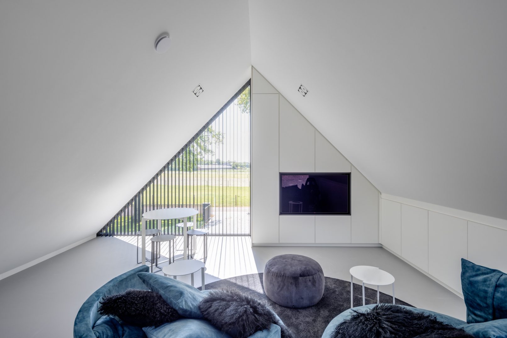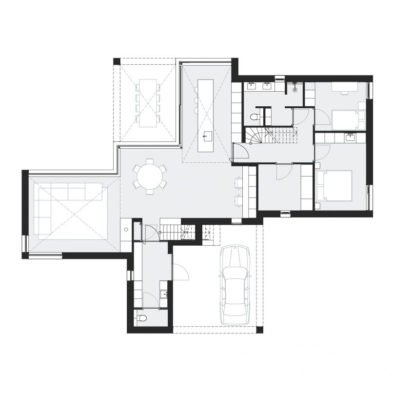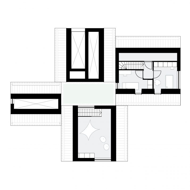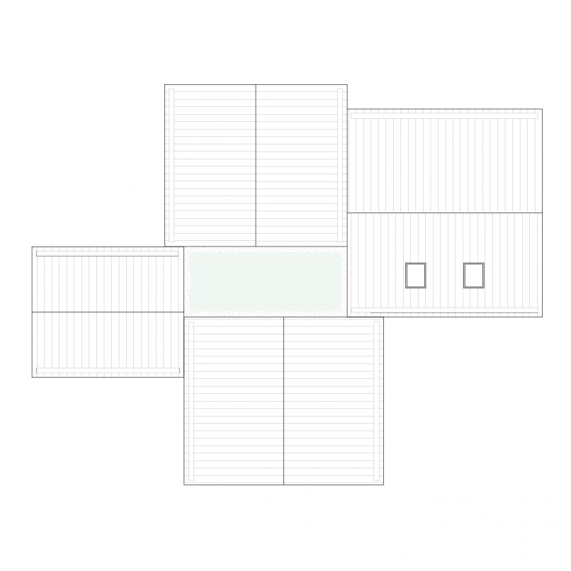 In het hart van de woning, het kruispunt, bevindt zich de centrale ruimte met eettafel en een multimedia hoek. Deze ruimte is de plaats van binnenkomst waarlangs alle ruimtes in de woning worden ontsloten. Je verlaat of betreedt de woning niet zonder deze centrale ruimte te passeren. Aan de westzijde van het kruis bevinden zich de twee vleugels met zitkamer en leefkeuken. Samen omsluiten deze vleugels het buitenterras richting de tuin gericht op de avondzon. Van binnenuit worden de vleugels gekenmerkt door een grote mate van openheid en transparantie naar de tuin. Vides, zowel binnen als buiten, zorgen voor zicht richting de kronen van de bomen. De entreevleugel bevat voorzieningen zoals toilet en carport, maar heeft daarnaast ook een trap naar de ontspanningsruimte die zich onder de kap van deze vleugel bevindt. De driehoekige gevelopening biedt zicht op het decor van het weidse landschap aan de voorzijde. De laatste vleugel, aan de oostzijde, in de luwte en met ochtendzon bevat badkamer, wasruimte en alle slaapvertrekken.