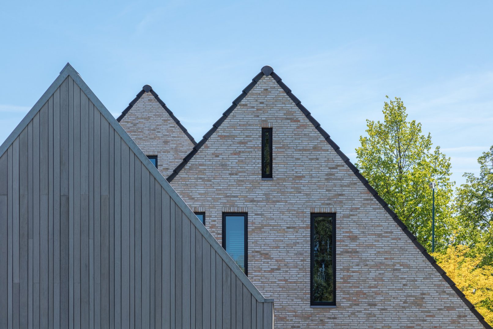 De volumes worden allemaal gekenmerkt door een archetype hellend dak vorm welke typerend is voor een huis of schuur. Proporties en materialisering wordt ingegeven door de wensen vanuit het programma. Zo is de keuken de houten koppeling met veel glas tussen de bakstenen en geborgen volumes met daarin woonkamer en eetkamer. Op de verdieping is dit eveneens de koppeling tussen de slaapkamers van de kinderen in het voorste bakstenen volume en de ouder slaapkamer in het andere bakstenen volume. De relax ruimte kan worden gezien als houten tuinhuis. De wanden hiervan zijn volledig in glas en verdwijnen wanneer geheel geopend in de gevels.