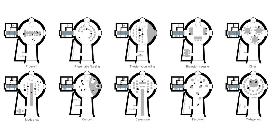 Dit heeft ons doen nadenken over mogelijk gebruik van ‘De Volksvriend’ en de rol welke de toevoeging daarin zou moeten hebben. De belangrijkste conclusie was dat de begane grond in de molen een fantastisch, bijna theatraal, karakter heeft. Wat ontbreekt zijn enkel de voorzieningen om deze ruimte creatief te kunnen programmeren. Na het maken van een lijst met potentiële programma’s hebben we gedestilleerd wat primair aanwezig dient te zijn en wat incidenteel als losse elementen ingebracht kan worden. De gewenste vaste facilitaire voorzieningen bestaan uit een mindervaliden toilet, een pantry, kastruimte, een meterkast en een kleine bergruimte.