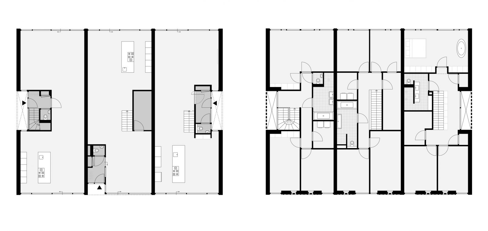 De organisatie en ruimtes zijn voor alle drie de woningen ontworpen op basis van specifieke wensen van de bewoners. Er is voor gekozen om het gewenste industriële karakter van het interieur niet tot uiting te laten komen door het toepassen van bijvoorbeeld onafgewerkte wanden of leidingwerk in het zicht, maar door de voorkomende interieurelementen vorm te geven als duidelijke elementen die zijn ontworpen vanuit de materiaaltechniek en detail. Door de toepassing van warm gewalst staal voor de trap met ingeklemde treden, beton voor het kader in het keukeneiland, rvs werkbladen en gelamineerde panelen uit afgepeld beukenhout voor kasten wordt het interieur een verlengstuk van het exterieur.