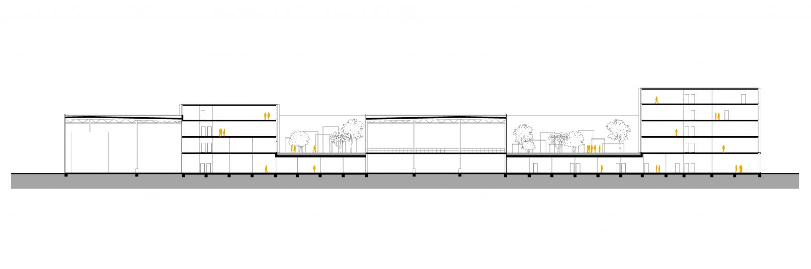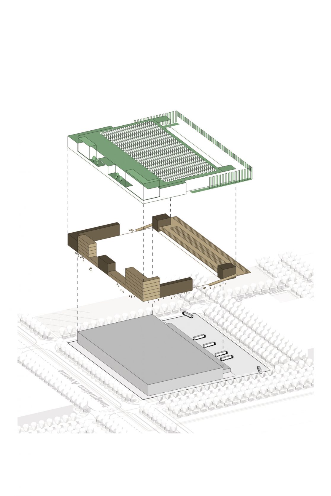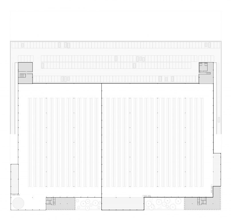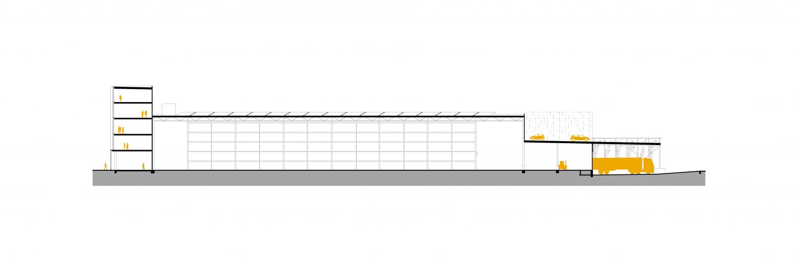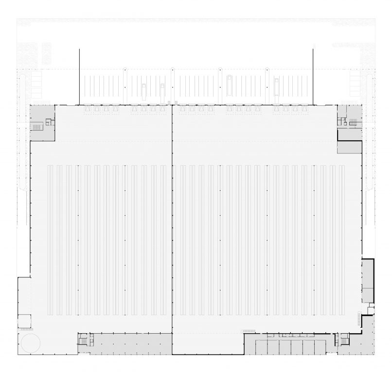 De kantoren zijn ondergebracht in de transparante volumes in de schil met op de eerste verdieping rechtstreekse toegang tot de daktuinen. Ondersteunende faciliteiten zoals de traforuimte, sprinklertank en adr ruimtes liggen in de gesloten volumes van de schil waarmee de rechthoekige kern geheel vrij is en geoptimaliseerd voor de logistieke operatie. De laaddocks en logistieke verkeersbewegingen zijn gelegen aan de achterzijde van het gebouw. Daarboven bevindt zich het parkeerdek voor personenauto’s dat middels twee hellingbanen zelfstandig verbonden is met de wegenstructuur. Hiermee worden de twee verkeersstromen van elkaar gescheiden. Het parkeren op afstand van de kantoren maakt dat gebruikers gestimuleerd worden kort te wandelen tussen het parkeren en de kantoren en het activeert de openbare ruimte langs de schil van het gebouw.