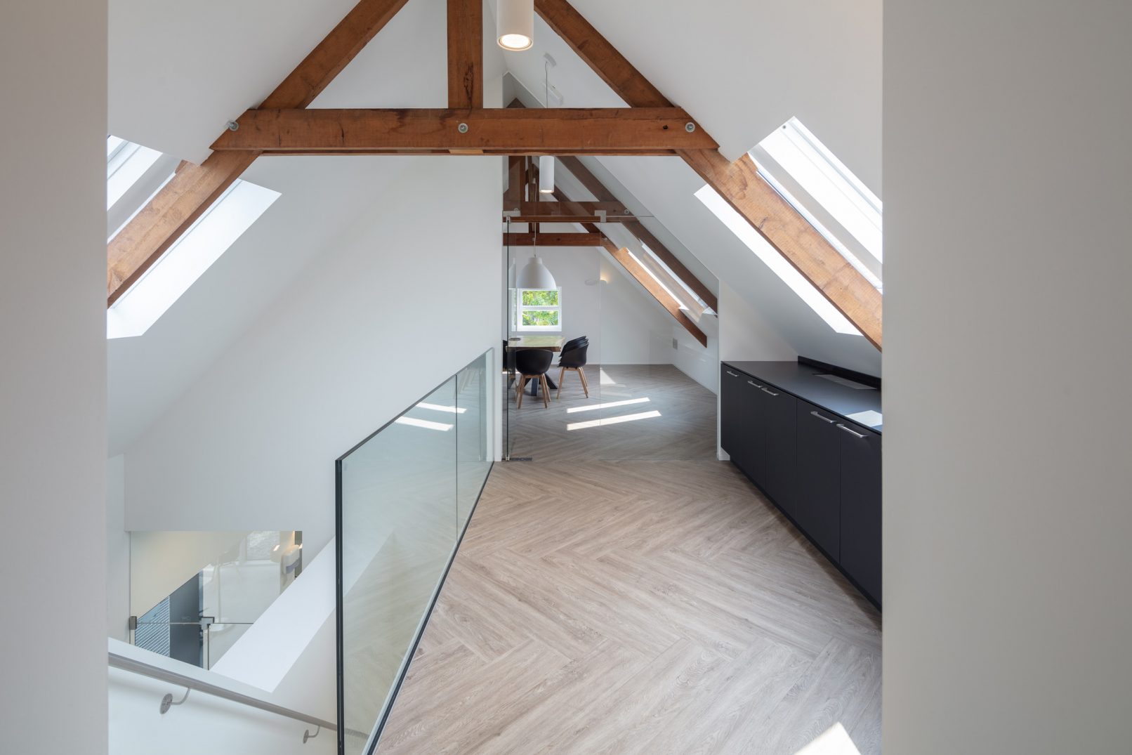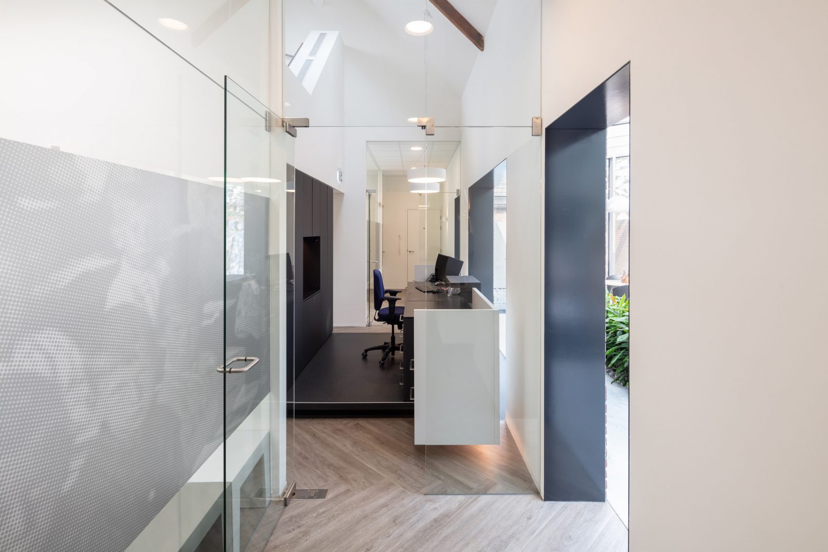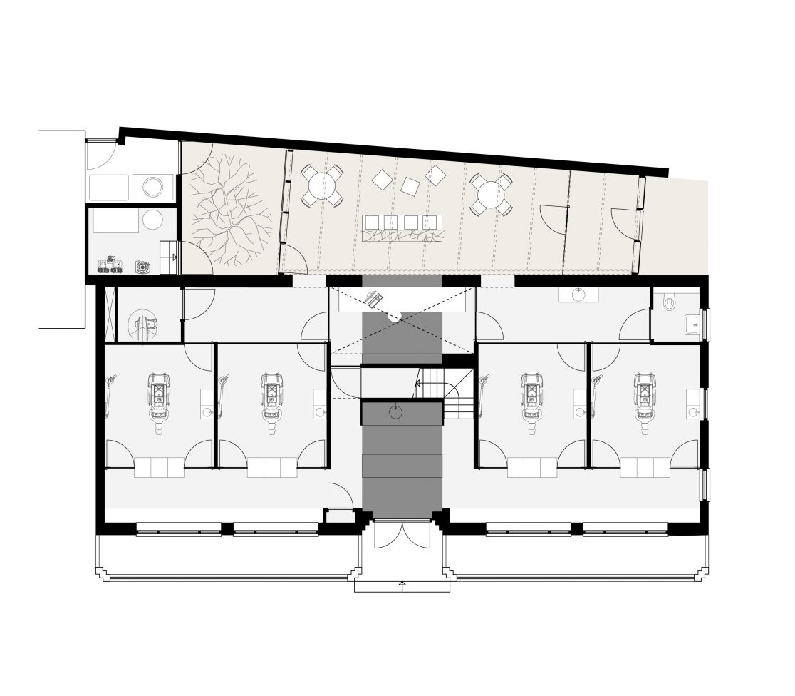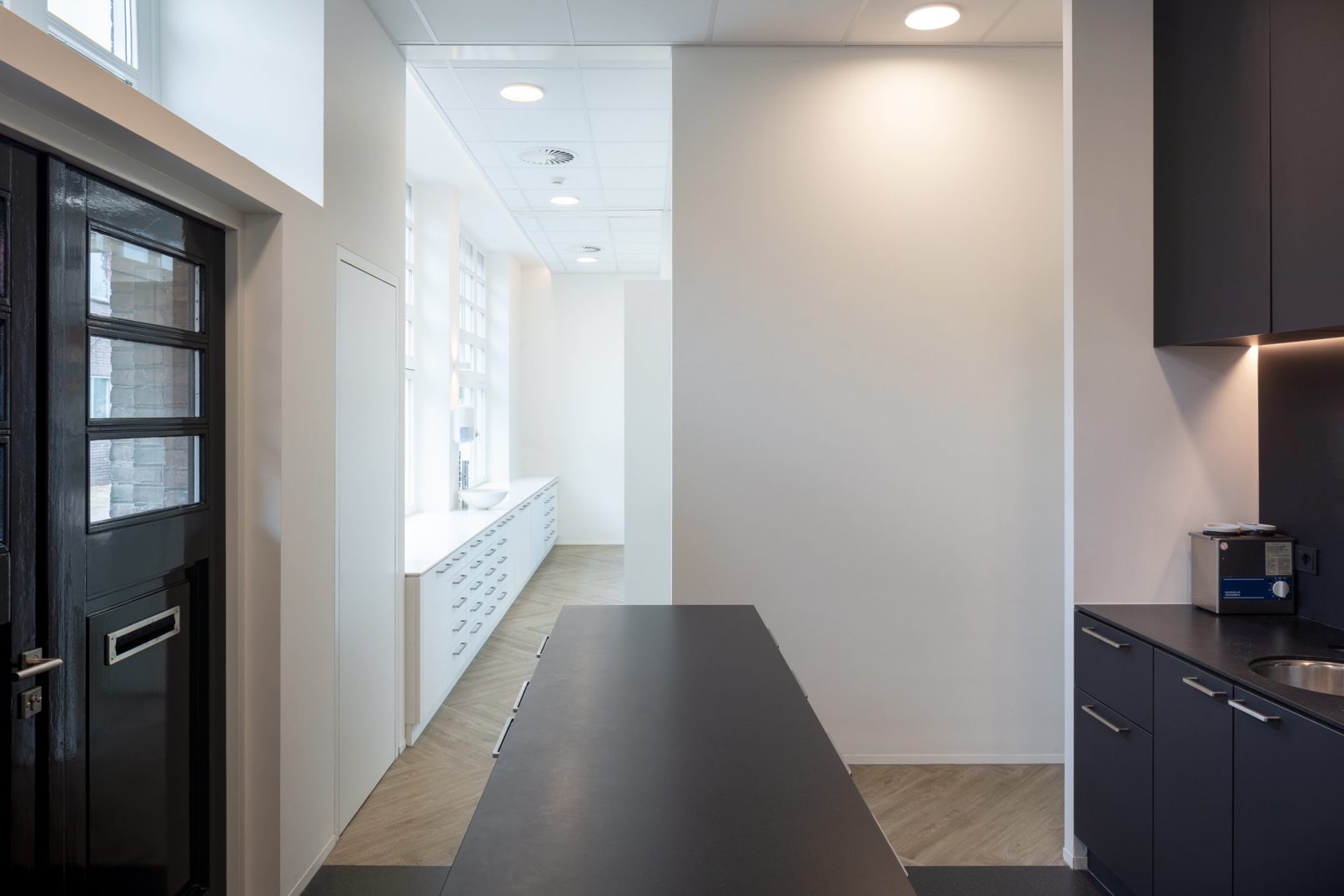 Het bestaande pand bestond uit een gang met links en rechts een leslokaal. Deze structuur is leesbaar gehouden door in de gang centrale functies als trap, receptie en sterilisatie te plaatsen. Ieder voormalig leslokaal is ingevuld met twee behandelkamers. De zolder is ingedeeld met kantoor, kantine en overige personeelsvoorzieningen. Het mooie ritme van de houten spanten is hier zichtbaar gehouden. Een vide zorgt voor extra lichtinval in de receptie en voor de gasten is zo bij ieder bezoek een glimp op te vangen van de kap.