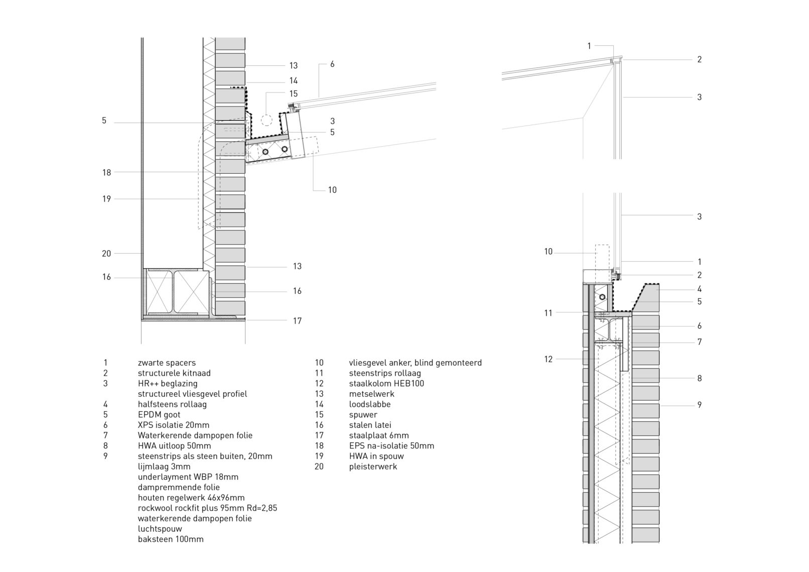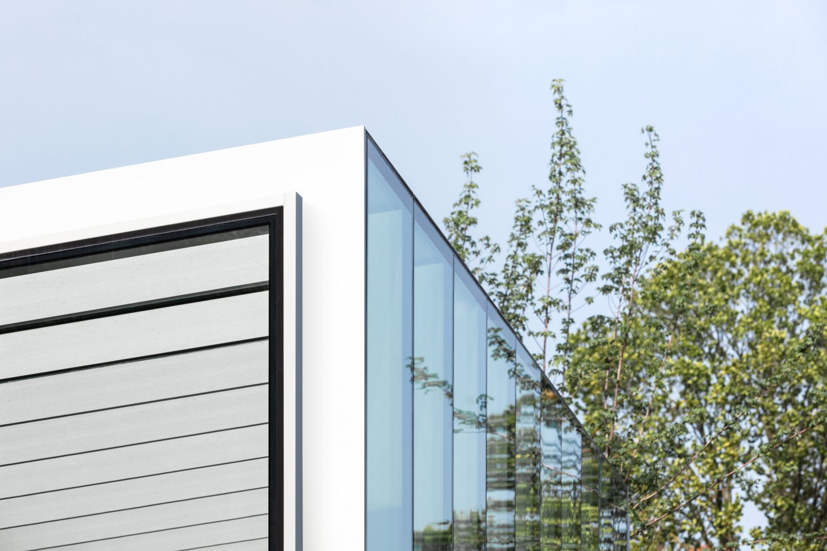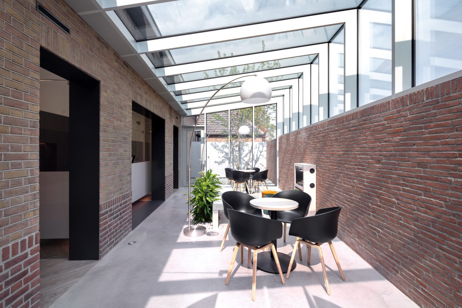 De materialisatie van de nieuwe glazen uitbouw is opgebouwd uit blank geanodiseerde aluminium vliesgevel portalen. Het glazen dak is een taps toelopend hellend vlak waardoor ieder portaal en glasvlak anders van maat is. Aan de straatzijde is het hoogste punt van de vliesgevel en is de bovenlijn horizontaal gehouden. Hierdoor krijgt de uitbouw meer allure. De glas-op-glas aansluitingen en de rustgevende herhaling van de vliesgevel portalen dragen bij aan de transparantie van de wachtruimte.