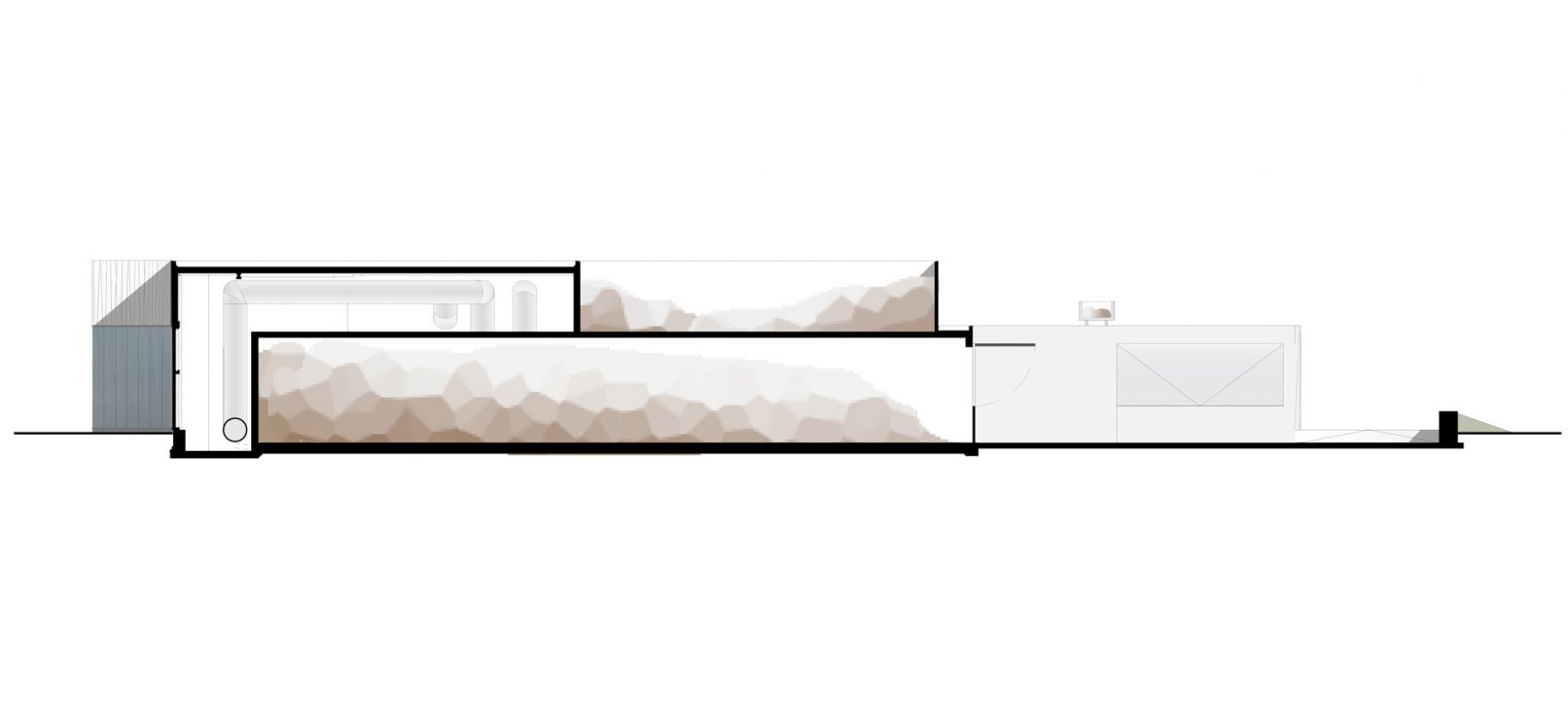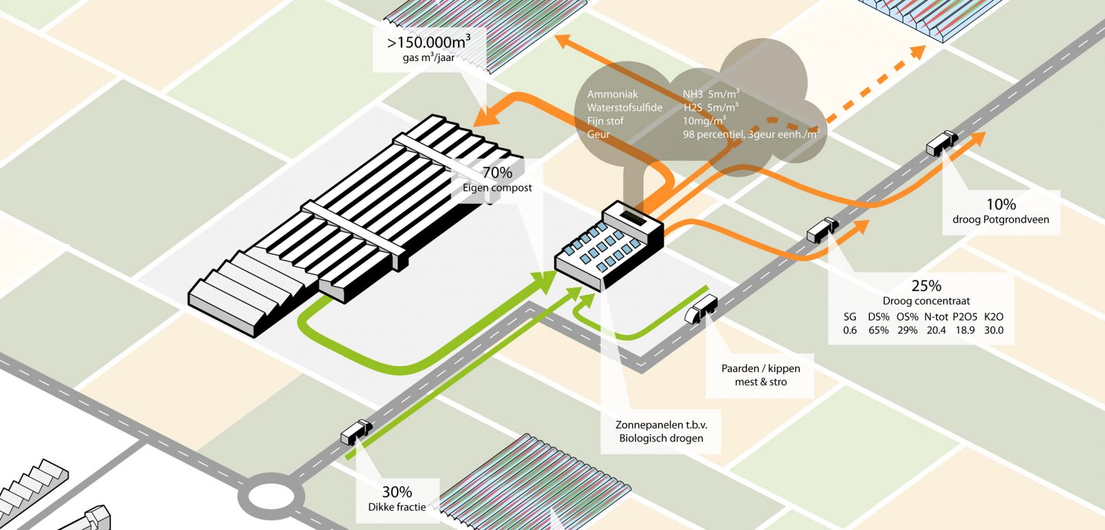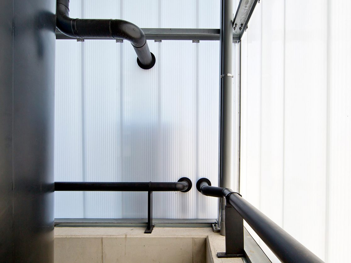 Om de ruimteclaim van het gebouw zo beperkt mogelijk te houden hebben we ervoor gekozen om de procestechniek en het biofilter bovenop de tunnels te stapelen. Evenals de tunnels zijn deze drie elementen als dichte volumes vormgegeven in prefab beton. De gestapelde volumes schuiven over de translucente service ruimten aan de voorzijde van de tunnels heen. In deze translucente service ruimte bevinden zich de voorraadtanks, plenums, ammoniakwasser en warmtewisselaars.
