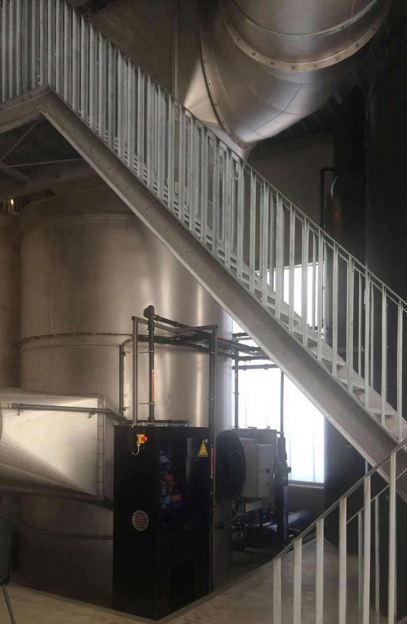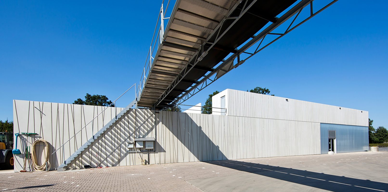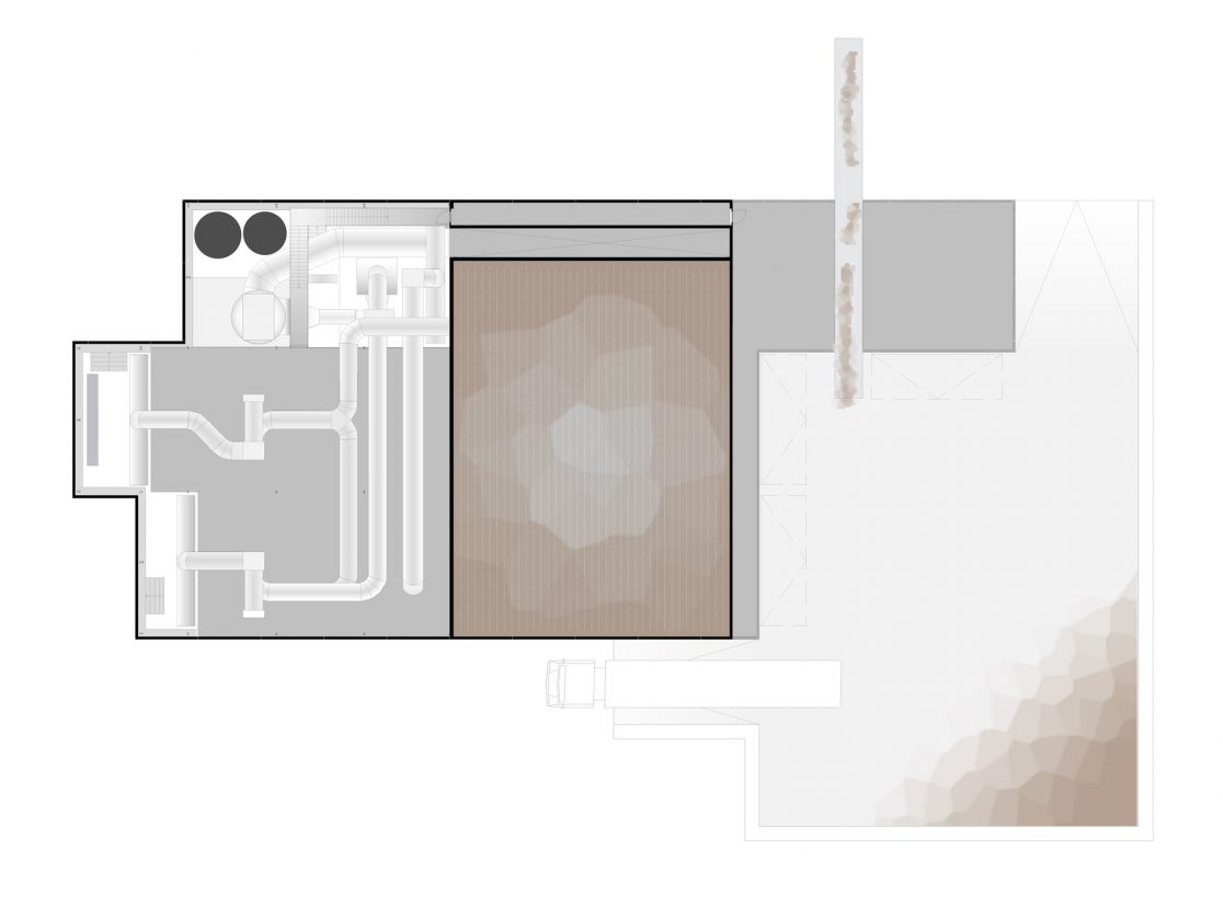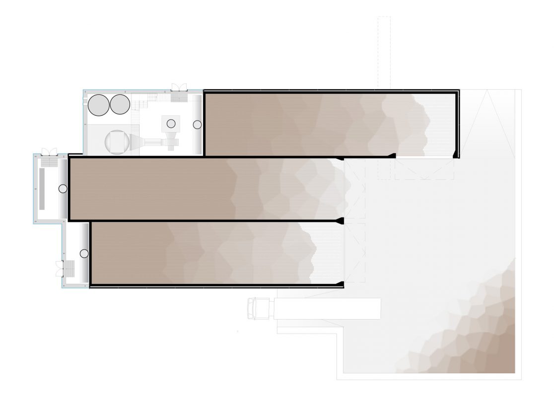 Om de ruimteclaim van het gebouw zo beperkt mogelijk te houden hebben we ervoor gekozen om de procestechniek en het biofilter bovenop de tunnels te stapelen. Evenals de tunnels zijn deze drie elementen als dichte volumes vormgegeven in prefab beton. De gestapelde volumes schuiven over de translucente service ruimten aan de voorzijde van de tunnels heen. In deze translucente service ruimte bevinden zich de voorraadtanks, plenums, ammoniakwasser en warmtewisselaars.