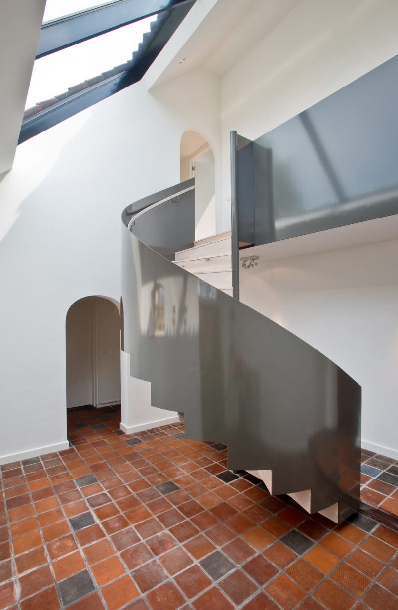 Centraal in de woning en achter de voordeur ligt de entree. Niet alleen centraal door haar positie in het midden van de woning maar ook doordat deze door de dag heen veelvuldig gebruikt wordt als passage tussen diverse andere ruimtes. Door de verdiepingsvloer boven de entree weg te halen ontstond ruimte om de steektrap te vervangen door een elegante spiltrap midden in de vide. De trap is ontworpen in plaatstaal, de balustrade dient als drager en de treden zijn van onder getrapt zichtbaar alsof het hout tussen de spil en balustrade ingeklemd zit waarmee het als een object in de ruimte gaat werken. Boven de entree en vide deden we de meest opvallende ingreep in het exterieur. Een sparing in het hellende dakvlak over de volledige breedte en diepte van de entree. Hierdoor stroomt het licht rijkelijk naar binnen en ontstaat vanuit de overloop tegelijkertijd een prachtig uitzicht over de landerijen.