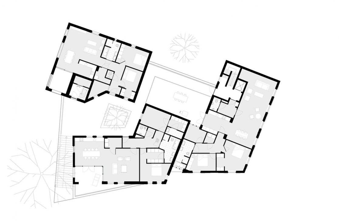 Het gewenste programma was het creëren van commerciële ruimten en voorzien in luxueuze appartementen. Commerciële functies zijn veelal agressief en dominant als het gaat om het gebouw zelf. Voorop staat presentatie mogelijkheden, flexibiliteit en functionaliteit. Dit gegeven hebben we een plek gegeven in een doorlopende plint over het gehele bouwblok. Door deze plint ontstaat flexibiliteit in het gebruik van deze ruimten en de alzijdigheid geeft maximale mogelijkheden van presentatie en functionaliteit. Tegelijkertijd ontstaat er iets heel moois… Een luie trap voert je naar een Bel-etage of piano nobile bovenop de agressor waar het wonen een plek heeft gekregen. Een verhoogd platform waardoor de mogelijkheid ontstaat om midden in het centrum heerlijk in de luwte te wonen.