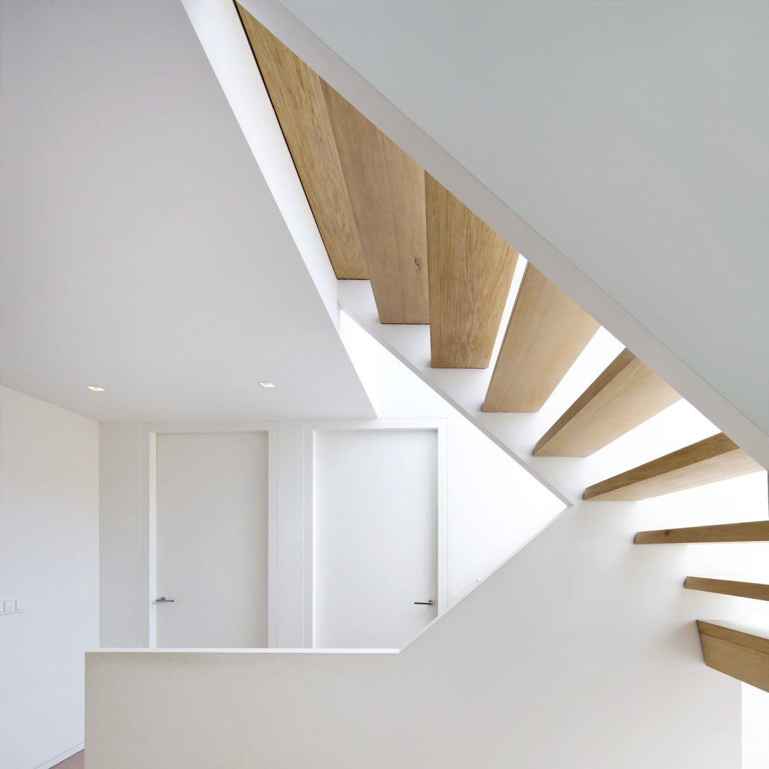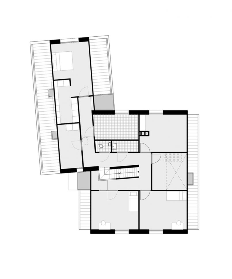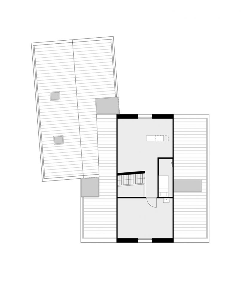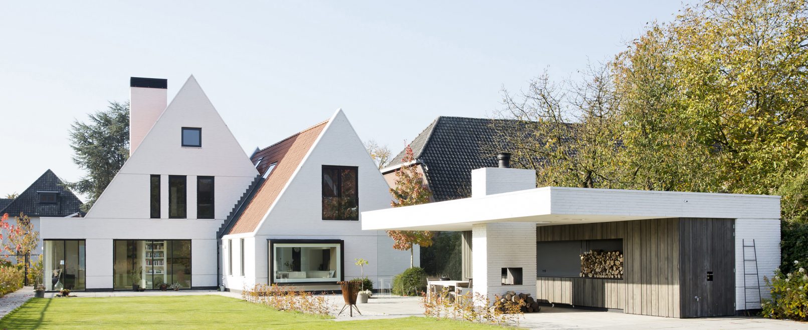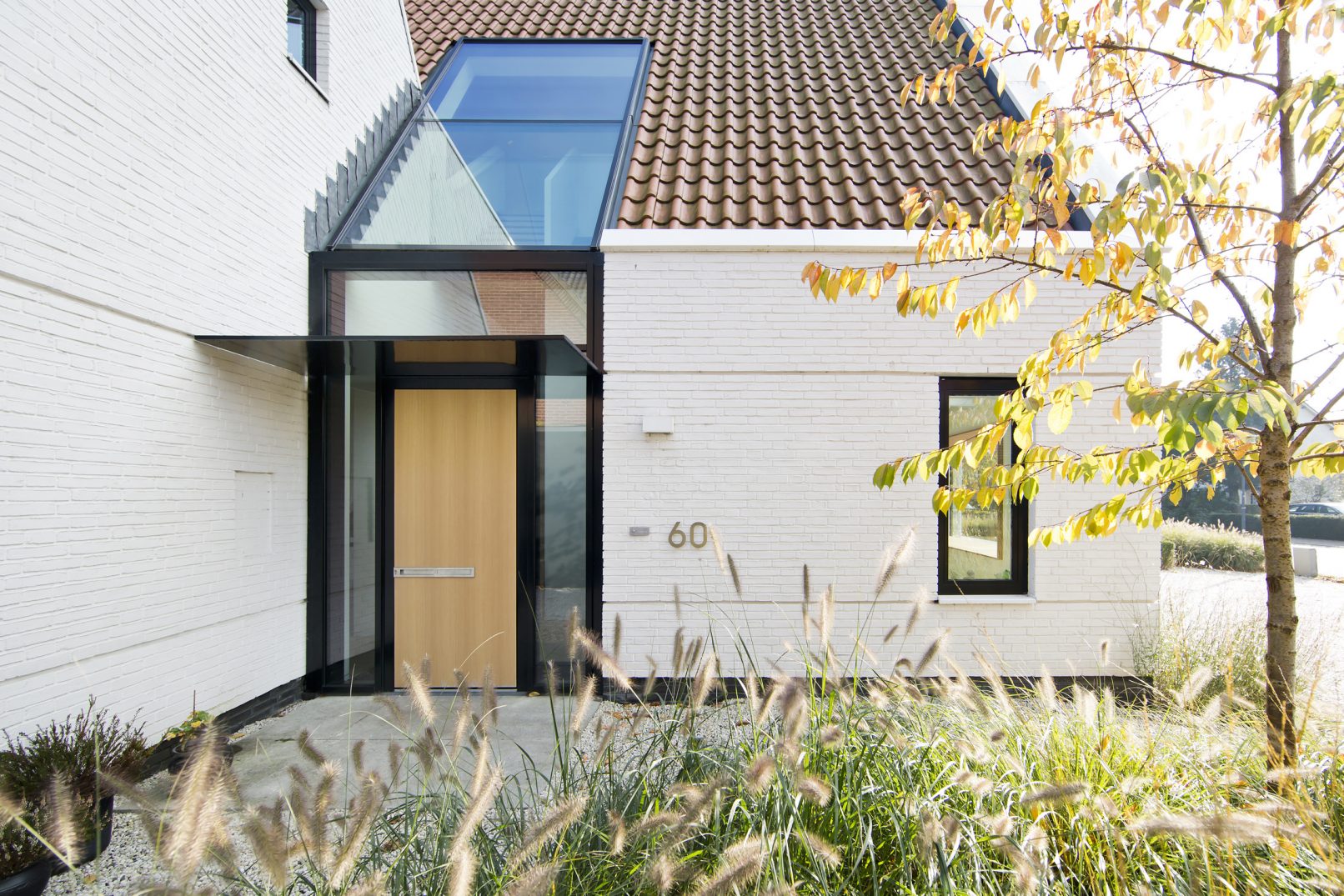 De eerste en meest ingrijpende ontwerp beslissing was om de woning haaks op de weg te oriënteren. Hierdoor waren we in staat om een open karakter aan de voorzijde te maken en het contact met de diepe tuin te versterken. Het dakvlak gericht naar de aangrenzende percelen kan op deze manier hoofdzakelijk gesloten blijven. De kapvorm, een zogenaamd zadeldak dat veelvuldig in het lint voorkomt, heeft een lage goot gekregen waardoor deze vriendelijk en weinig statig aanvoelt. Aan de linkerzijde van de woning bevind zich een bijbouw als een kleinere versie van het hoofdvolume. Deze bijbouw is versmolten met het hoofdvolume en kent een verdraaiing doordat de perceelgrens gevolgd wordt. Door het naar de achterkant uitlopen van de perceelgrens opent de woning zich naar de achtertuin. Op de twee plekken waar het hoofdvolume en de bijbouw in elkaar grijpen liggen vide’s en zijn de entree’s vanuit de voor- en achterzijde gemaakt. De gekozen materialen voor het exterieur zijn traditioneel van aard, baksteen en een golvende keramische dakpan, beide in een groter formaat. Dit versterkt het gewenste gevoel dat de woning kleiner aanvoelt dan deze in werkelijkheid is.