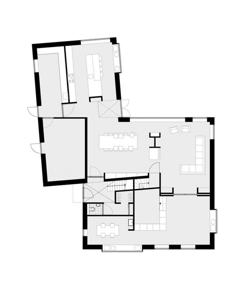 Het uitgebreide leefprogramma op de begane grond loopt vloeiend in elkaar over. Als een kralensnoer zijn de ruimtes aan elkaar geschakeld vanaf de straatzijde tot aan de keuken aan de tuinzijde. Deze aaneenschakeling van ruimtes begint en eindigt met een gigantisch ´bloemenraam´. Zo groot en diep dat je er in kunt zitten en zelfs liggen. De ruimtes zijn op diverse manieren aan elkaar geschakeld, met een haardelement ertussen, met en suite deuren en door een hoger gelegen opkamer. Het volledige interieur is ontworpen vanuit gebruik, rust en samenhang. Een wastafel in de knutselhoek, een verdekte opstelling voor de gameconsole en televisie van de kinderen, houthaard en televisie gecombineerd, de eikenhouten trappen overlopend in de vloeren en bedstedes voor op de kinderkamers zijn een aantal van de interieurelementen. Iedere ruimte is gecomplimenteerd met een precies passend en tijdloos element. Het samenspel tussen het exterieur en het interieur maakt dat deze twee elkaar versterken en er een ‘gesamtkunstwerk’ ontstaat.