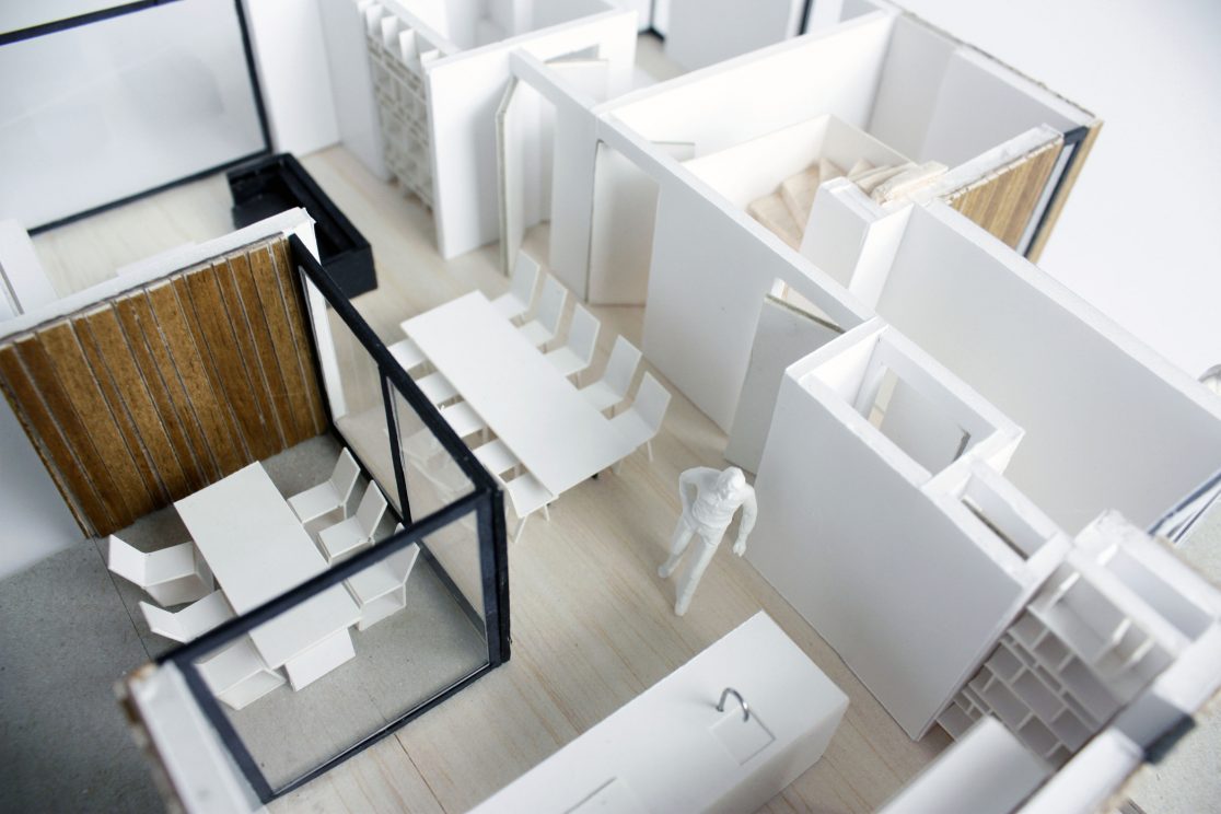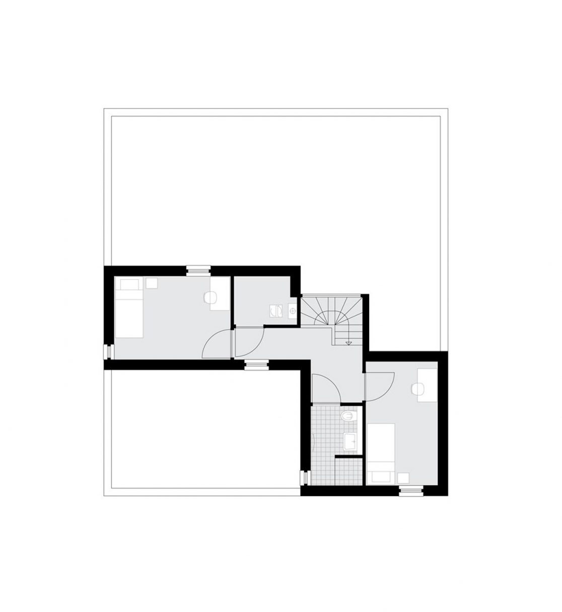 Het relatief kleine resterende programma op de verdieping bestaat uit de logeerkamers en een techniekruimte. Deze ruimtes zijn juist recht boven de twee uitsparingen gepositioneerd waardoor een heel dynamisch beeld ontstaat. Een spel van massa en leegte. De massa’s op de verdieping lijken te passen in de leegtes op de begane grond doordat de buitenwanden van beiden ten opzichte van elkaar verschoven zijn. Daarbij ontbreekt een kolom bij de carport waardoor het lijkt of de zwaartekracht geen vat heeft op het woonhuis wat het dynamische beeld verder versterkt.