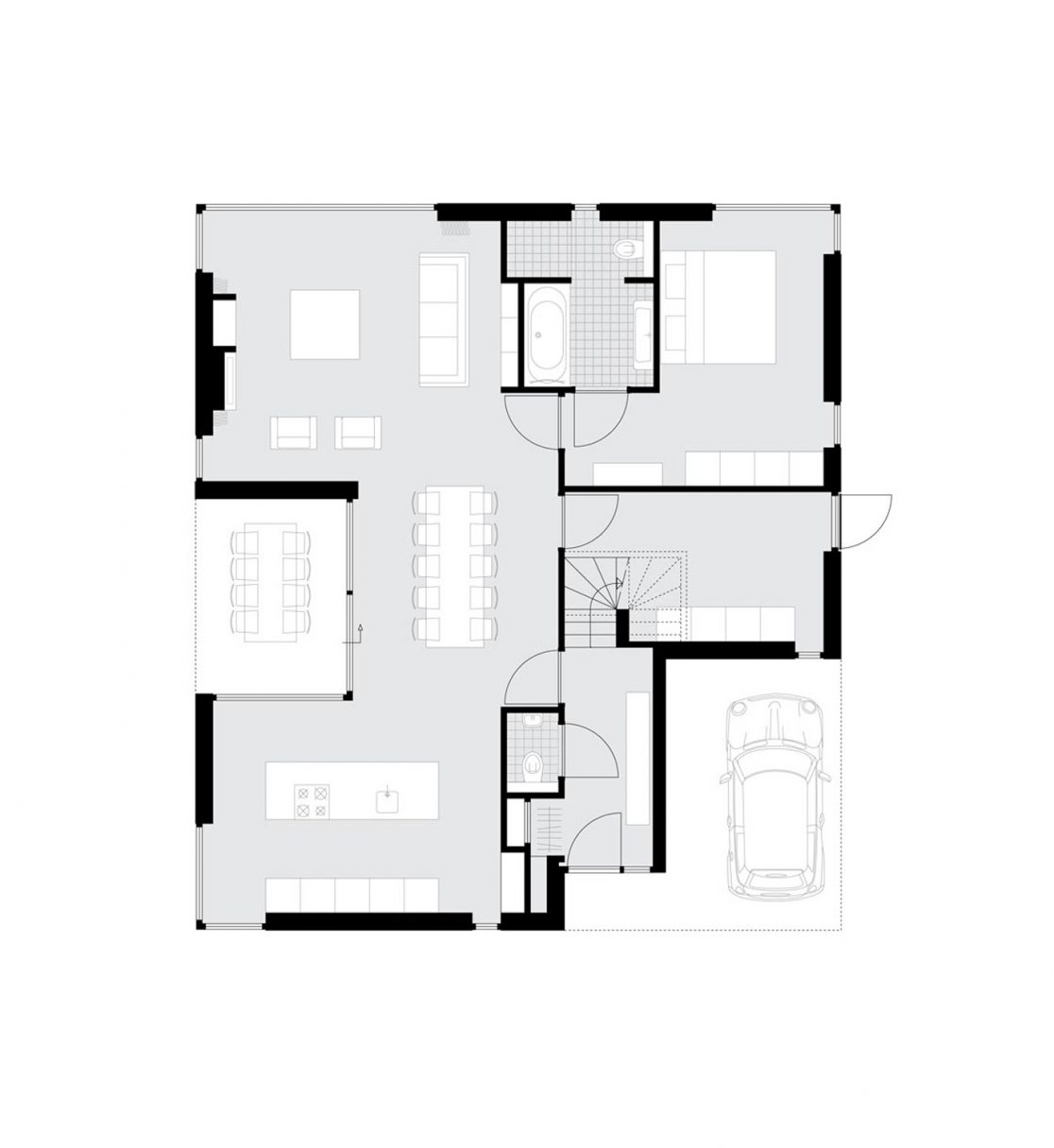 De begane grond heeft een compacte bijna vierkante plattegrond gekregen met daarin twee uitsparingen. Deze uitsparingen in de plattegrond zijn de plekken waar de belangrijkste verbindingen met buiten gemaakt worden. Aan de voorzijde hebben we ruimte gemaakt voor het droog parkeren van de auto. Tevens accentueert deze hap uit de begane grond op een vanzelfsprekende manier de entree van de woning. De tweede uitsparing maakt ruimte voor het overdekt terras met daaromheen de woon- en eetkamer en de keuken. Op deze manier ontstaat een speelse aaneenschakeling van de leefruimtes en ontstaan er diagonale zichtlijnen door de woonvertrekken heen.