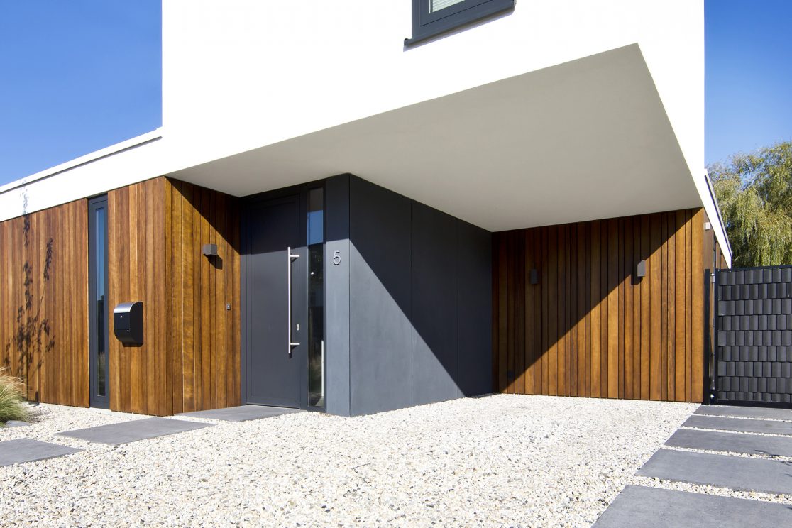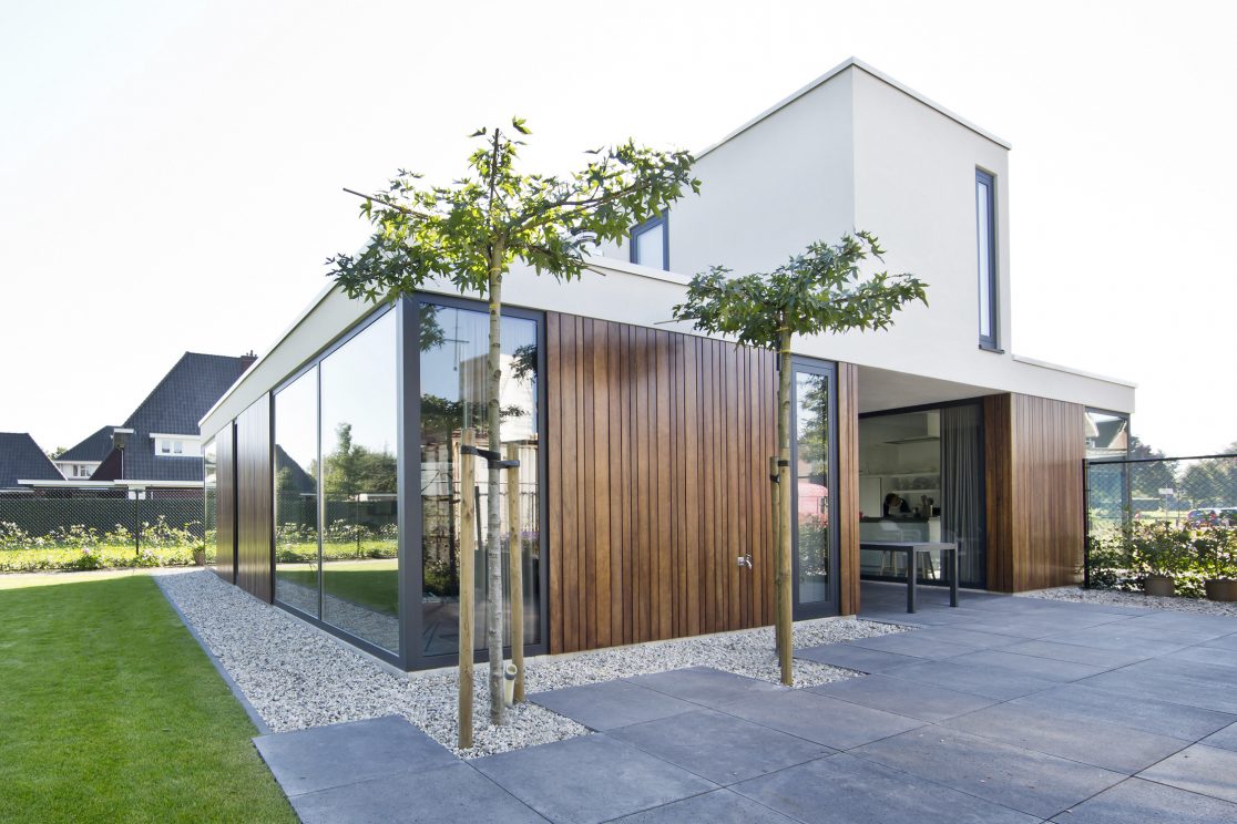De gekozen materialisatie en belijning ondersteund het schijnbare zweven van de bovenbouw. Op de begane grond is gekozen voor verticale houten delen met daartussen verdiepingshoge verticale aluminium kozijnen. De hoekramen versterken het rondom doorlopen van de verticale elementen op de begane grond. Tegelijkertijd benadrukken de hoekramen de diagonale zichtlijnen door het woonhuis heen en maken ze juist op de hoeken sterk contact met buiten.