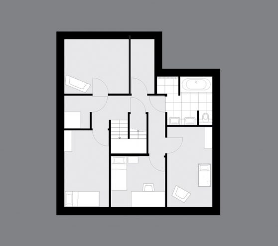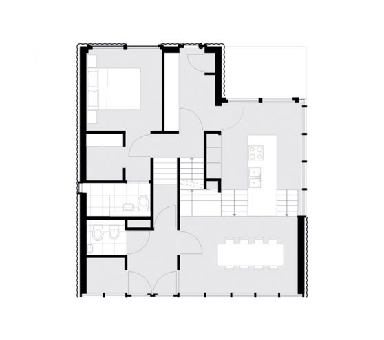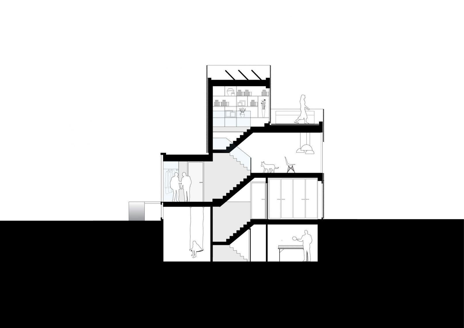 Programmatisch is er een sterke scheiding tussen privaat en semi-privaat ontstaan. Door het eetkamer niveau te verhogen loopt het programma voor dagelijks gebruik vloeiend in elkaar over. Tegelijkertijd zorgt dit verhoogde niveau ervoor dat het slaapprogramma, dat zich introvert verstopt onder de grond, voorzien wordt van veel daglicht. Hierdoor is er binnen het wonen een geoptimaliseerde plek voor het individu en voor het collectieve, het gezamenlijke.